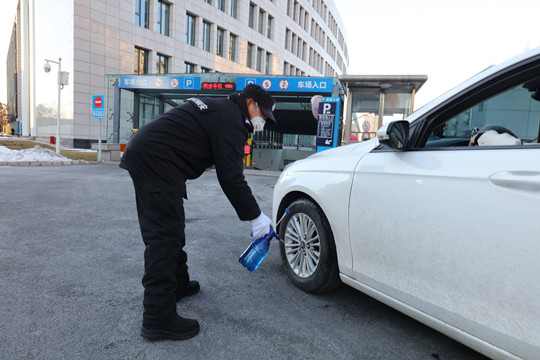 (準(zhǔn)備進(jìn)入地下車庫(kù)的車輛正接受輪胎消毒)