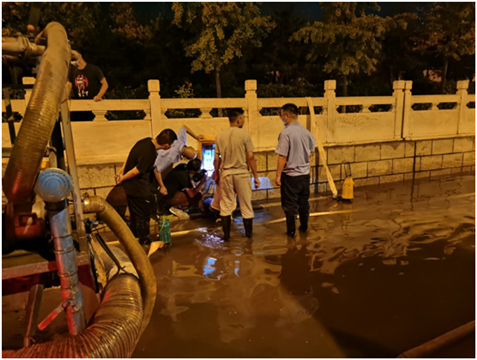 19時(shí)30分,區(qū)住建委傳達(dá)防汛排澇應(yīng)急搶險(xiǎn)救援命令:“萬(wàn)星市場(chǎng)鐵路橋涵下,積水十分嚴(yán)重,行人車輛都無(wú)法通過(guò),給市民造成不便和危險(xiǎn)。搶險(xiǎn)隊(duì)需前往抽干積水、清除淤積雜物。”接到命令后,集團(tuán)公司立即響應(yīng)區(qū)住建委號(hào)召,迅速啟動(dòng)“防汛應(yīng)急預(yù)案”,由集團(tuán)公司副總經(jīng)理、總工程師陳勁親自披掛上陣,全面部署極端天氣下的應(yīng)急處置工作。為確保當(dāng)天搶險(xiǎn)工作順利開展,由集團(tuán)公司承建的101中學(xué)懷柔校區(qū)擴(kuò)建項(xiàng)目應(yīng)急搶險(xiǎn)隊(duì)立即進(jìn)入備戰(zhàn)狀態(tài)。項(xiàng)目經(jīng)理、搶險(xiǎn)隊(duì)隊(duì)長(zhǎng)張二祥快速組織13名防汛值班隊(duì)員將防汛物資、設(shè)備裝車,第一時(shí)間奔赴搶險(xiǎn)點(diǎn),按預(yù)案分工有條不紊進(jìn)行設(shè)備安裝積水抽排。經(jīng)過(guò)一個(gè)半小時(shí)的艱辛努力,萬(wàn)星市場(chǎng)鐵路橋涵下終于恢復(fù)原貌,市民和車輛順利通行,搶險(xiǎn)隊(duì)順利圓滿完成了應(yīng)急搶險(xiǎn)救援任務(wù),得到了廣大市民和區(qū)住建委的一致好評(píng)。