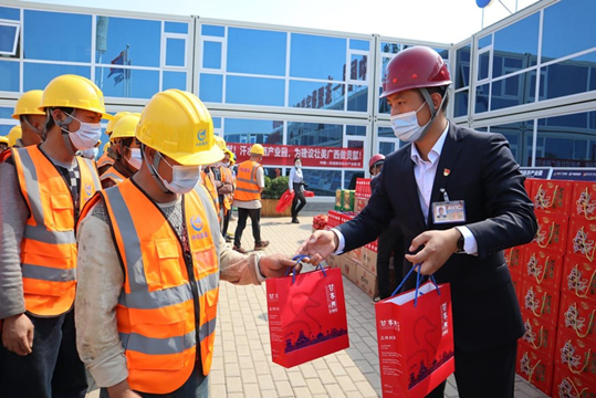活動現(xiàn)場項目管理人員為工友們發(fā)放“過年禮包”